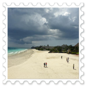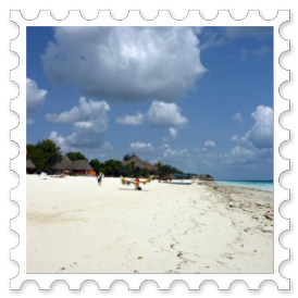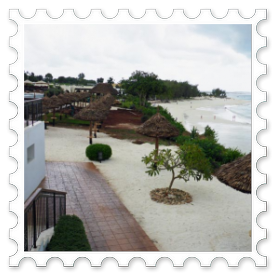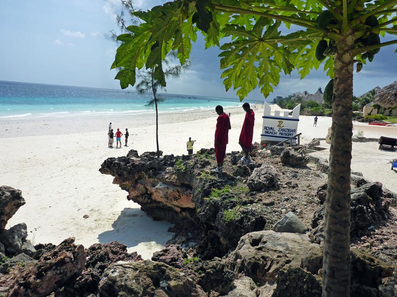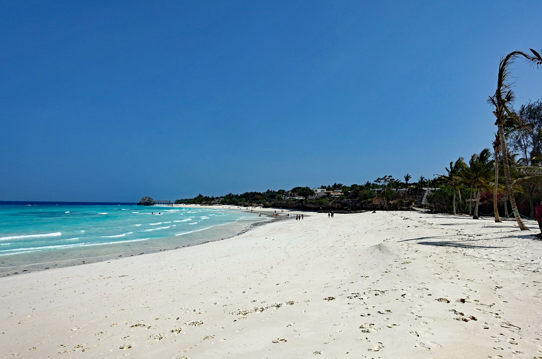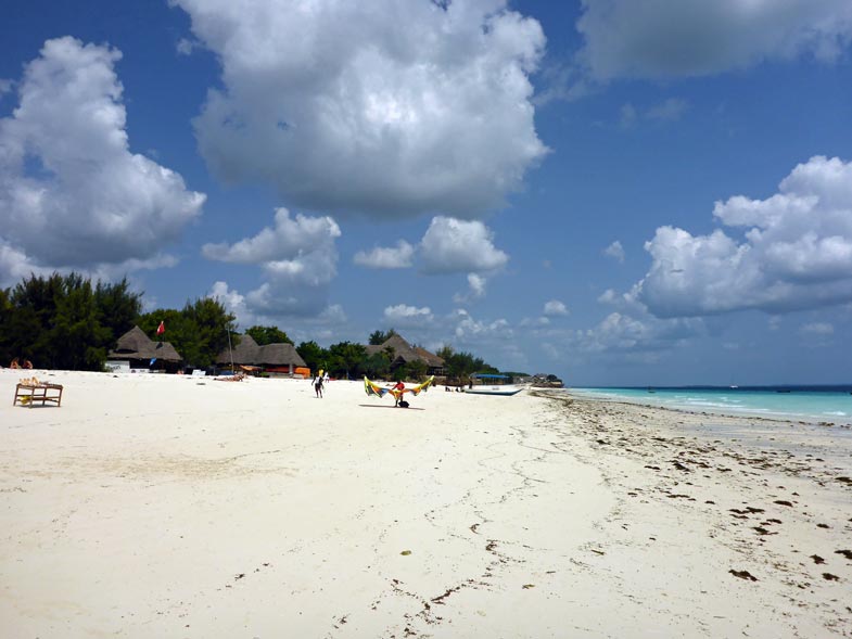 Alles ist sauber und ordentlich; wir sind zufrieden, räumen unsere Sachen ein und legen uns erst einmal auf eine Liege am Strand. Der Himmel ist blau mit ein paar leichten Wölkchen. Dazu weht ein leichter Wind und freie Liegen gibt es genug in der Anlage. Der Sand ist fast weiß und fein wie Puderzucker. Das Meer ist türkisgrün und sauber bis auf ein paar kleine Seegrasbrocken, die darauf schwimmen. Unter den Palmen und Sonnendächern gibt es genug schattige Plätzchen, sodass die Temperatur sehr angenehm ist. Wir merken, dass wir in der Nacht nur wenig geschlafen haben und holen einiges nach. Gegen Mittag meldet sich der leere Magen und wir essen einen Happen im Strandrestaurant. Kellner und Angestellte sind äußerst freundlich. Alle werden mit "Jambo" begrüßt und wir lernen die beiden wichtigsten Ausdrücke für einen Strandurlaub auf Sansibar: "Pole pole" = Immer mit der Ruhe! und "Hakuna matata" = Kein Problem!
