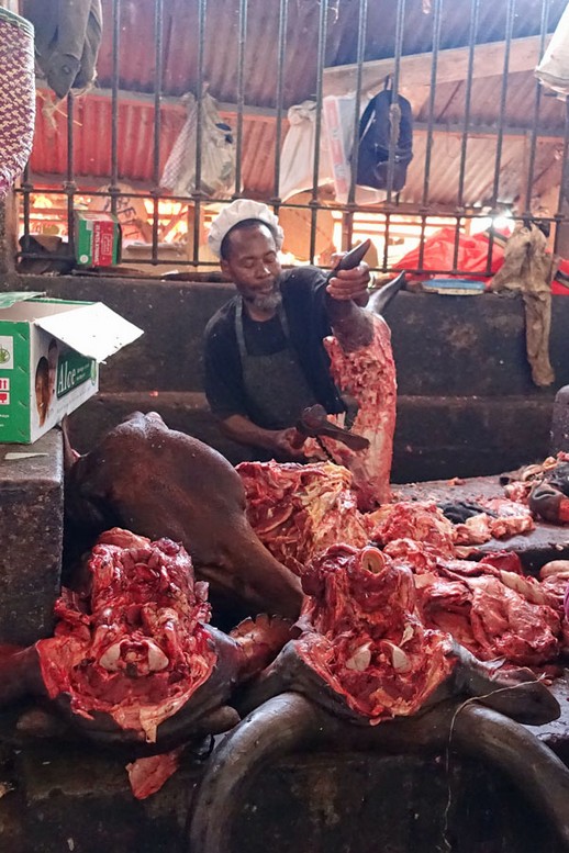 Für Geflügel gibt es eine eigene Markthalle, aber auf die verzichten wir, als wir den großen Korb mit den Küken und jungen Hühnern sehen. Die hygienischen Bedingungen, unter denen das Fleisch auf dem Markt verkauft wird, können natürlich nicht mit denen verglichen werden, die wir von Europa gewöhnt sind.