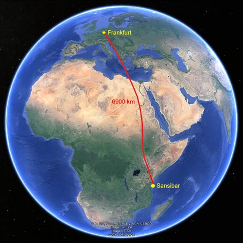 Um 21:00 hebt unsere Boeing 767-300 von Condor in Frankfurt ab und nach total ruhigem Flug landen wir 9 1/2 Stunden später in Sansibar.