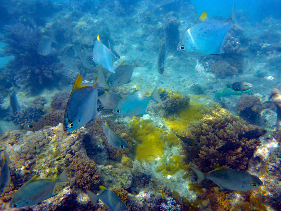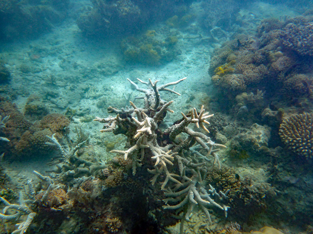 Das Riff ist ziemlich tot; einige Korallenfische tummeln sich zwischen den verbliebenen Korallen. Leider ist das Wasser ziemlich milchig und die Sonne scheint auch nicht richtig. Schade - dabei sah es so gut aus, als wir abgefahren sind.
