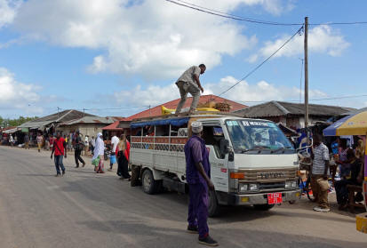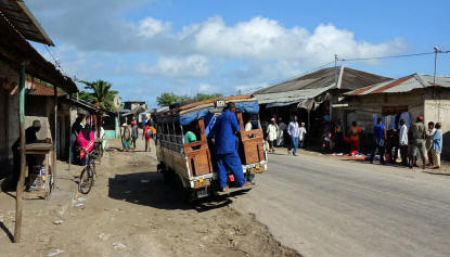 Das erleben wir dann eine dreiviertel Stunde später in dem Ort Mkokotoni. Offiziell dürfen 23 Fahrgäste in den Minibus einsteigen, in Wirklichkeit sind es immer mehr. Allerdings stehen an der Landstraße oft Polizeiposten, die die Busse anhalten und das kontrollieren. Viele Sansibari fahren aber nicht mit den Linienbussen, sondern mit einem "Daladala", das ist ein Sammelbus, wie er in vielen orientalischen Ländern gebräuchlich ist. Er fährt eben nur ab, wenn sich genug Fahrgäste eingefunden haben und hält immer dort, wo ein Fahrgast aussteigen will. Der Schaffner steht hinten auf der Plattform.