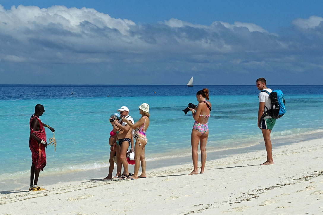 Natürlich haben auch alle die Fotosucht der Touristen als neue Geldquelle entdeckt. Ein typisches Beispiel: Am Strand liegt ein Seestern - eigentlich nichts Besonderes. Ein Massai hebt ihn auf und sofort fragen 4 Touristen brav, ob sie ihn fotografieren dürfen. Sie haben ja vom Reiseleiter erzählt bekommen, dass die Massai es ja nicht gern haben, wenn man sie fotografiert und deshalb solle man sie vorher fragen. "Zwei Dollar" sagt er und die Touristen zücken die Cameras und die Portemonnaies...