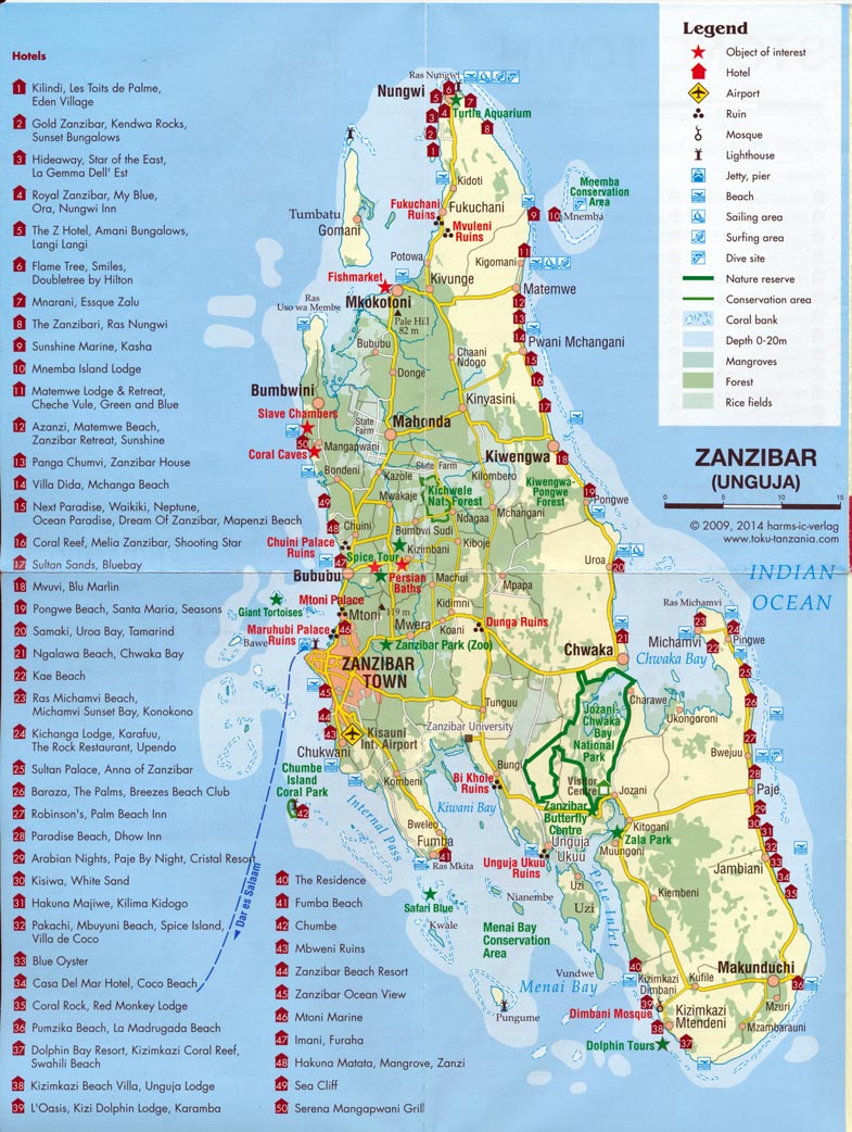 Auf der Karte sieht man, dass der Ort Mkokotoni schon ziemlich weit im Norden an der Westküste liegt. Von dort bis nach Nungwi ist es nicht mehr weit. Wir fahren allerdings nicht ganz bis dorthin, sondern biegen kurz vorher ab zum Hotel La Gemma dell ´Est, das auf der Karte mit der Nummer 3 gekennzeichnet ist. Die Karte haben wir von den Tour-Veranstaltern bekommen, die die Ausflüge auf der Insel organisieren und in jedem Hotel vertreten sind. Sie bietet einen guten Überblick und zeigt, dass Nungwi im Norden gar nicht mit so vielen Hotels vollgestopft ist, wie überall behauptet wird. Sansibars Einkünfte kommen heute vom Tourismus, denn der Gewürzhandel wirft aufgrund der niedrigen Preise bei weitem nicht mehr so viel Geld ab wie früher. 1 1/2 Millionen Menschen wohnen hier, wobei es mehr als 50 Inseln sind, die dazu gehören.Die beiden großen Inseln heißen Unguja und Pemba. Die Bevölkerung ist sehr arm und lebt vom Fischfang und der Landwirtschaft, denn aufgrund der ungeheuren Korruption versinkt das Geld aus dem Tourismus und dem Handel in den unergründlichen Taschen irgendwelcher Beamten, Politiker oder Firmen. Eine große Scheibe von dem Kuchen schneidet sich noch das Festland Tansania ab, denn der Inselstaat Sansibar ist eine teilautonome Republik von Tansania.