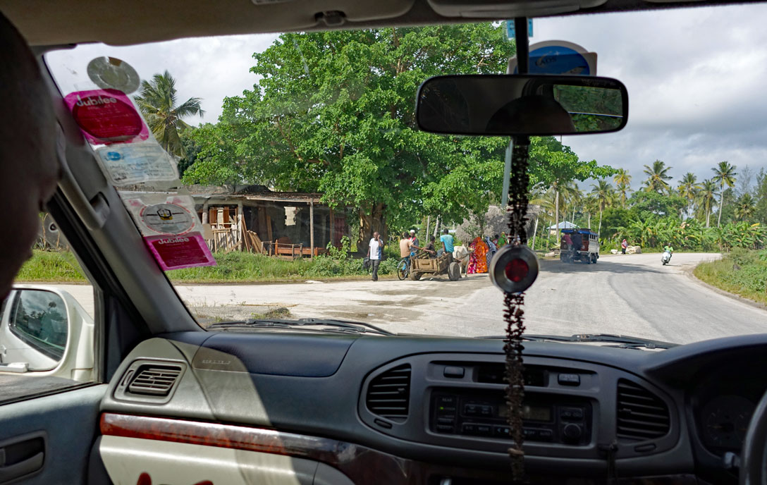 Der Blick über das Armaturenbrett unseres Minibusses vermittelt ein realistisches Bild von den Straßen im Innern Sansibars: Die Hauptstraße ist asphaltiert, aber links und rechts ohne Begrenzung. Die nach links abbiegende Nebenstraße ist eine Schotterpiste. An der Straßenkreuzung ist eine Haltestelle, von der gerade der Daladala (Sammelbus) abfährt. Die Frauen warten auf einen anderen Bus, das Kuhtaxi auf Fahrgäste. Wer es sich leisten kann, hat einen Motorroller, die anderen haben ein Fahrrad. Privatautos sieht man kaum auf der Straße. Handys haben alle, die sich mit Tourismus oder Handel beschäftigen. Die Bauern und Fischer sind zu arm dafür.
