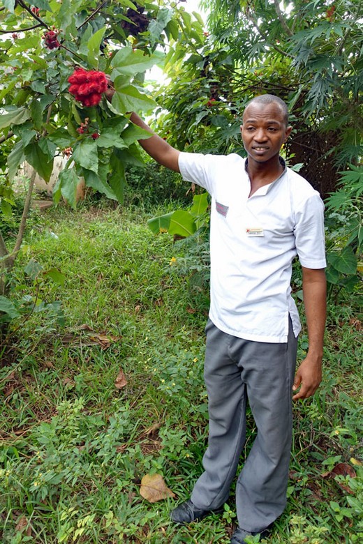 Ismail, unser Führer, hat uns hierhin gefahren, versteht aber von den Pflanzen nicht viel. Er lässt sich auch wie wir die einzelnen Bäume und Sträucher erklären. In der Hand hält er einen Zweig des "Lippen-Baumes", der dort so genannt wird, weil die Farbe der Blüten von den Sansibaris zum Schminken verwendet wird. Einen anderen Namen für den Baum kennt er auch nicht.