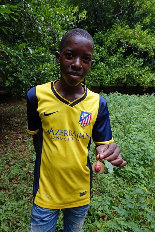 Zuerst müssen wir raten, welche Bäume das sind, unter denen wir stehen. Wir tippen auf einen Maracujabaum, weil die Früchte so aussehen. Dann holt er eine herunter und zerlegt sie mit einem Messer. Wir sind ganz erstaunt, dass es schöne rote Muskatnüsse mit weißen Streifen sind, die zum Vorschein kommen. Er versucht uns zu erklären, was man mit den Muskatnüssen machen kann, aber er spricht nur ein paar Brocken Deutsch und Englisch. Außerdem wissen wir, wozu man Muskatnüsse verwendet.