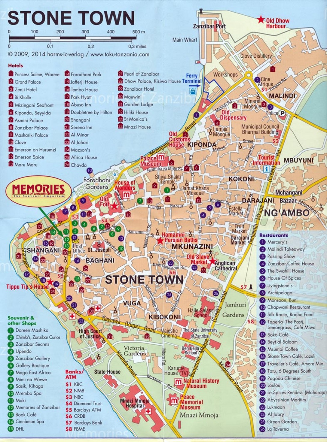 Die Karte zeigt die Altstadt von Stonetown mit den Sehenswürdigkeiten und stammt von dem Souvenir-Emporium Memories of Zanzibar. Das ist der größte Souvenirladen von Sansibar gegenüber von der Post. Mit spektakulären Sehenswürdigkeiten hält es sich in Grenzen. Ein Rundgang durch die schmalen Gassen der Altstadt ist aber durchaus interessant. Außerdem kommt man dabei an vielen sehenswerten Fassaden aus dem vorigen Jahrhundert vorbei. Mit Hilfe der UNESCO-Gelder sind sie teilweise schon restauriert worden. Das betrifft auch die geschnitzten Holztüren, die für Sansibar typisch sind. Allein in der Altstadt gibt es 200 Hier einige Fotos davon: