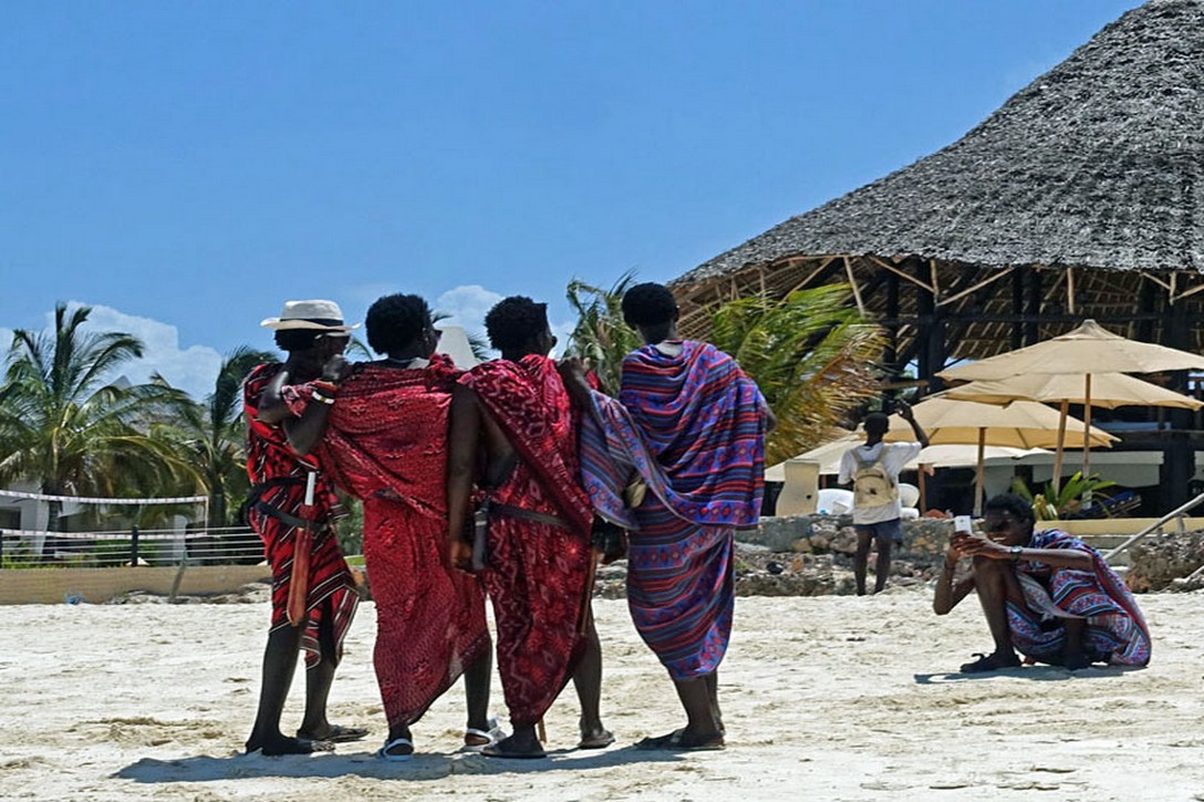 Es ist ein heißer Tag und wir müssen unsere Liegen immer weiter in den Schatten rücken. Ich setze mich auf eine Klippe am Strand und fotografiere die "Plastik-Massai", wie sie von den Einheimischen genannt werden. Manche sind echte Massai, andere haben sich als Massai-Krieger verkleidet und bilden mit ihren farbenfrohen Kostümen exotische Fotoobjekte für die Touristen. Besonders die italienischen Touristinnen sind lockende Ziele, die sie bei ihren Spaziergängen ansprechen und dann begleiten. Inzwischen sprechen viele von ihnen recht gut italienisch.