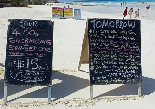 So buchen wir schließlich bei Xperience Tours einen Halbtagsausflug nach Stonetown, der aber 95 Dollar pro Person kostet. Die Preise hier sind happig. Ein Vertreter der Serena Hotelkette schlägt uns einen 2-Tage-Safari-Trip mit Übernachtung in Tansania vor, der 1000 Dollar pro Person kosten soll. Im Übrigen stellen wir fest, dass viele Gäste nach einer Safari in Tansania hier einige Tage Strandurlaub als Verlängerung gebucht haben.