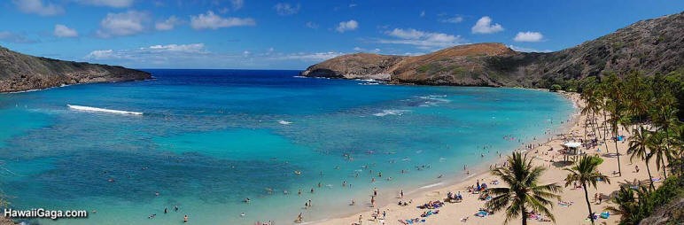 Sehr schöne Bilder von der Hanauma-Bay finden Sie auf der Webseite von Hawaii-Gaga, das ist eine Webseite mit sehr guten Informationen von allen Inseln. Auch das schöne Panoramabild stammt von dieser Webseite. Schauen Sie sich diese Seite einmal an; sie enthält auch ausgezeichnete Fotos mit ausführlichen Informationen zu allen Stränden. Ein Schiffswrack gibt es auch hier: The Mahi. Das ist ein alter Minenleger, der 1986 gesunken ist und nun in 20 m Tiefe südlich von Waianae sein muschelbedecktes und rostiges Dasein fristet. Viele Mantas, Riff-Haie, Schildkröten und allerlei bunte Fische haben hier ihr Zuhause. Für Tauchsportfreunde ist auch "Shark´s cove" interessant, das ist eine Unterwasserlandschaft aus Lavafelsen mit Wasserfällen. Sehr schön - mit vielen Fischen. Die Stelle liegt zwischen Pupukea und Haleiwa am Highway 83 und hat auch Duschen am Beach. Allerdings sollte man hier auch nur bei ruhigem Wasser schnorcheln oder tauchen.