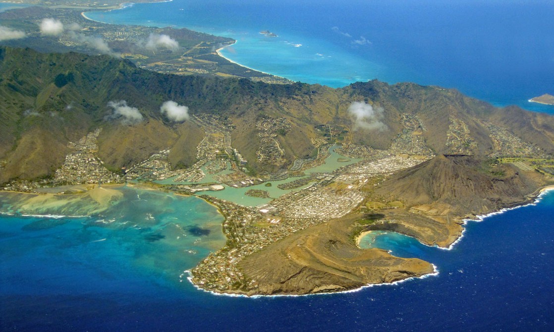 Das Bild habe ich aus dem Flugzeug geschossen, als wir von Honololu nach Maui flogen. Man kann sehr deutlich unten im Vordergrund den Koko Head und rechts davon den halb versunkenen Vulkankrater sehen, der voll Wasser gelaufen ist. Das ist die Hanauma Bay. Fährt man von Waikiki aus über Hawaikai in diese Richtung, kommt man an diese wunderschöne Bucht.