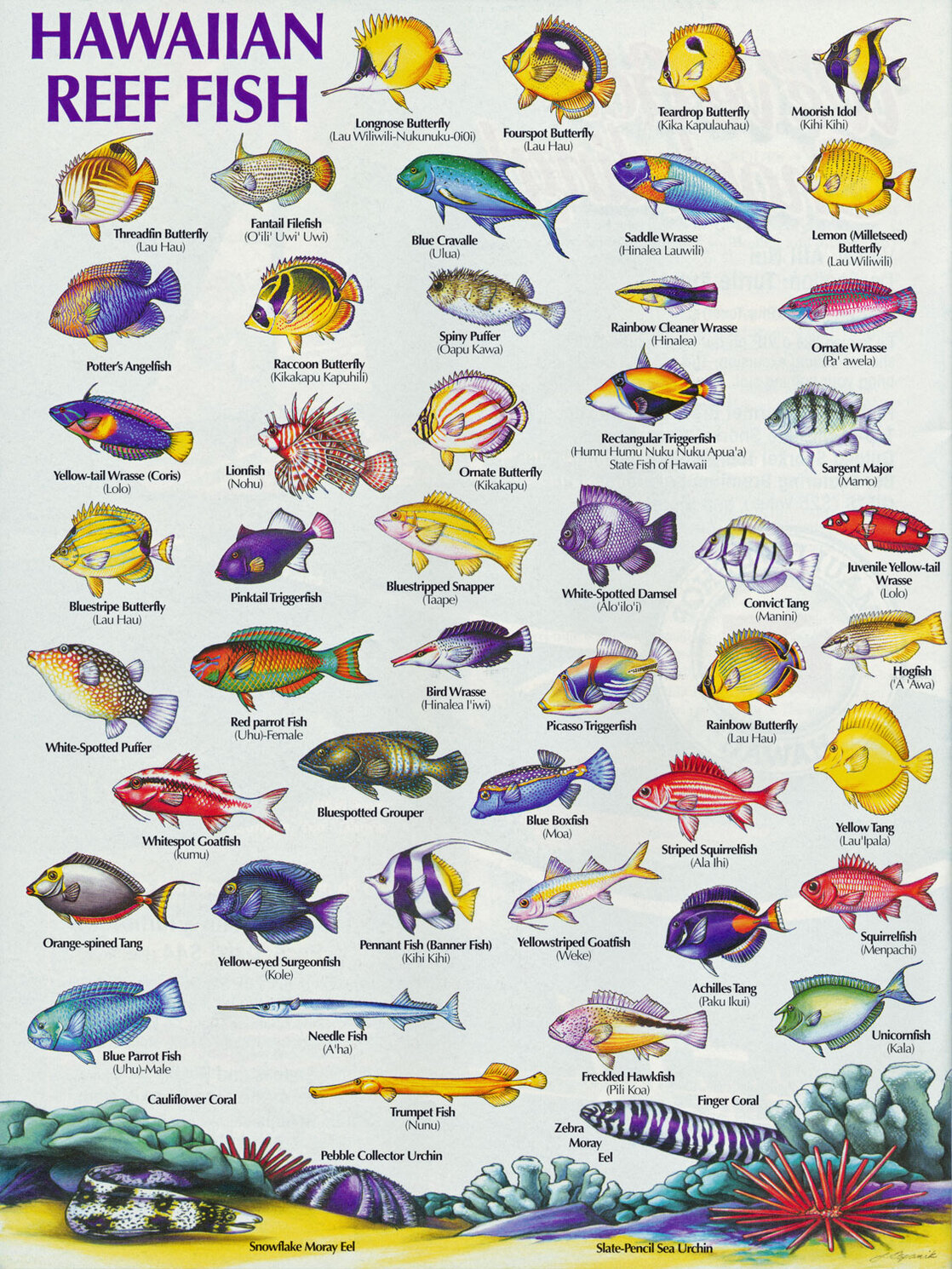 Die Karte mit den Riff - Fischen, wie sie in Hawaii überall zu finden sind, ist auch aus dem Maui Dive and Surf Magazine entnommen. Sie können sich das 64-seitige Magazin mit allen speziellen Hinweise von der Webseite des Maui Dive Shops herunterladen. Das lohnt sich: https://www.mauidiveshop.com/