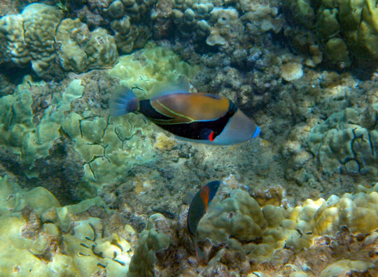 Geärgert hat mich immer, dass ich den Staatsfisch von Hawaii, den Humuhumunukunukuapua`a niemals so richtig vor die Camera bekommen habe. Dieser Triggerfish (auf deutsch: Drückerfisch) sieht so schön bunt aus, dreht sich aber immer weg, weg, wenn ich fotografieren will: