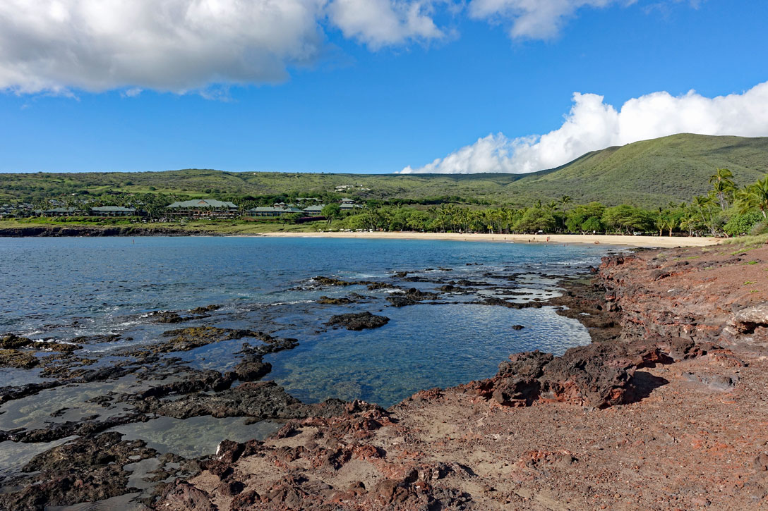 Das ist der Blick auf den Strand und auf das Manele Bay Resort im Hintergrund. Im Vordergrund sind die Tide-Pools, die sich gut zum Baden eignen. Zwischen den Lavafelsen im Wasser lässt sich gut schnorcheln und Sie können viele bunte Fische beobachten. Vorne ist der Strand sandig und ohne Steine und Korallen, dahinter folgt auf der linken Seite eine interessante Unterwasserlandschaft mit vielen bunten Fischen, grünen Meeresschildkröten und Muränen. Am besten ist die Sicht am frühen Morgen - dann treffen Sie übrigens auch auf die Delphine, die sich hier in den Morgenstunden herumtreiben.