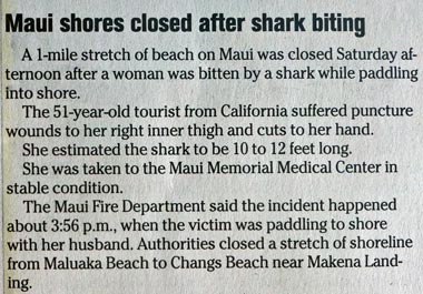 Die Zahl der Begegnungen mit Haien ist in den letzten Jahren stark gestiegen. Erstaunlicherweise kommen die Haie immer näher an die Küste und in Maui sind mehrere Hai-Unfälle passiert, wobei die Schwimmer nicht weiter als 50 m vom Strand entfernt waren. In den meisten Fällen sind es Surfer gewesen, die auf den Brettern lagen und vermutlich von den Haien aufgrund des Schattens als kranke Delphine angesehen wurden. Es ist bisher ungeklärt, was die Haie zu einem Biss animiert. Jedenfalls wird immer davor gewarnt, nicht in der Nähe von Flussmündungen oder undurchsichtigen oder schmutzigen Wasserbereiche zu schwimmen, weil Haie gern in solchen Gewässern jagen. Inzwischen sind wohl auch viele Haifamilien von Tigerhaien und Hammerhaien aus dem nördlichen Pazifik hinunter zu den hawaiianischen Inseln gewandert und sind dort heimisch geworden. Die Gefahren werden also zunehmen.
