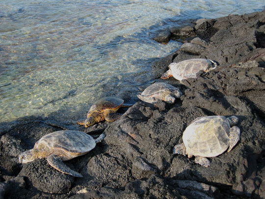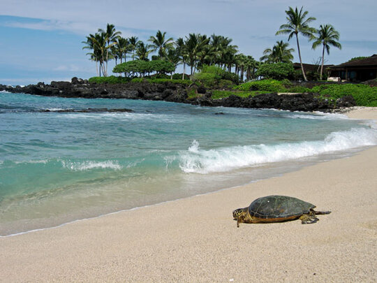 Wenn Sie interessiert sind, beim Schnorcheln große grüne Meeresschildkröten zu beobachten, sollten Sie an den Strand südlich vom Hualalai Resort fahren. Besonders nachmittags kommen sie oft ans Ufer und legen sich zum Ausruhen an den Strand.