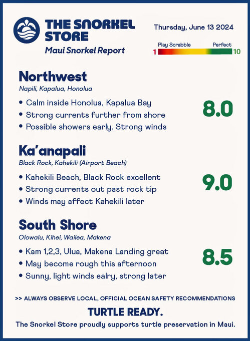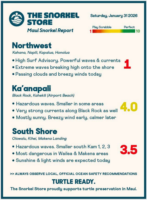 Es gibt neben den vier Unterwasser-Schutzgebieten noch weitere interessante Schnorchelgebiete auf der Insel. Ein Geheimtipp ist Oluwalu, das ist ein kleiner Strand am Meilenstein 14 auf der Strecke von Maalaea nach Lahaina. Kapalua Beach und Polo Beach sind auch gute Schnorchelreviere. Wenn Sie ganz sicher gehen wollen, können Sie den täglichen Schnorchel-Bericht von The Snorkel Store abonnieren: