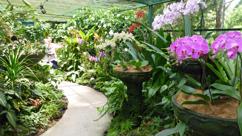Jede Orchidee schöner als die andere und man will mit dem Fotografieren gar nicht aufhören. Jede Blüte ist wundervoll und jede ist anders. Natürlich gedeihen alle Orchideen bei diesem tropischen Klima fantastisch. Aber die Hitze macht uns doch zu schaffen. Nach zwei Stunden müssen wir uns in den Schatten der Bäume flüchten uns spazieren lieber durch einen der Dschungelpfade als über die sonnigen Parkwege. So sind wir auch total happy über die Ventilatoren, die am Ausgang an der Haltestelle für die Taxis angebracht sind. Sie machen das Warten auf den Hippo Bus erträglich, mit dem wir dann zur Orchard Road fahren.