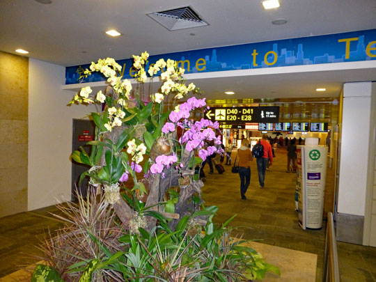 Der Flughafen ist nicht umsonst einer der schönsten der Welt: Orchideengärten empfangen uns; überall auf den Gängen blüht es, dazwischen gibt es farblich gestaltete Ruhezonen und Sanctuarien, das sind kleine Ökobereiche mit Pflanzen, Blumen, Wasserspielen und Sitzmöglichkeiten.