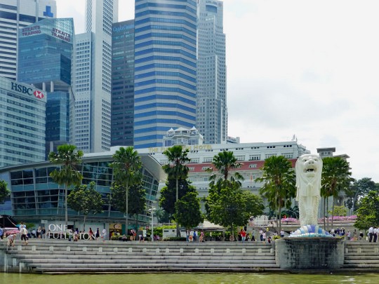 Der 8 m hohe "Merlion" ist das Wahrzeichen von Singapur. Das Wort ist zusammengesetzt aus "Mermaid" und "Lion" und bezeichnet die Fantasiefigur, die in der oberen Hälfte einen Löwen und in der unteren eine Meerjungfrau darstellt. Schließlich bedeutet Singapur ja auch "Löwenstadt".