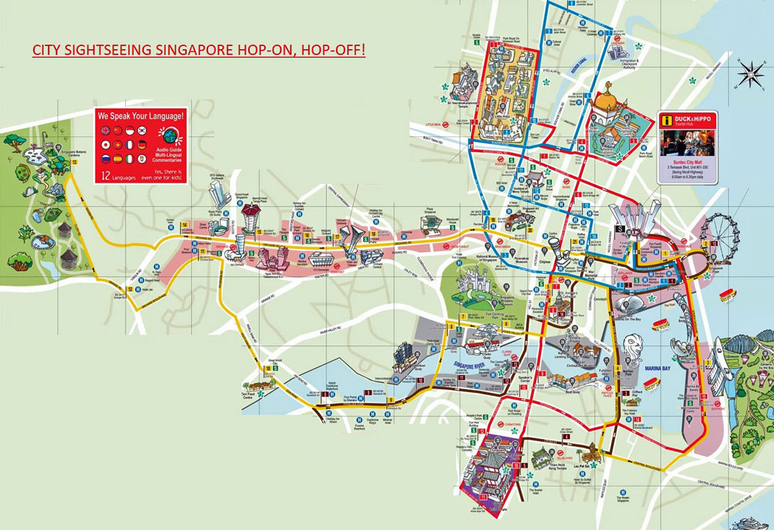 Das ist eine Karte von dem Singapore Airlines Hop-on Bus. Sie ist sehr gut als Überblick geeignet. Die Stellen für eine Besichtigung wichtigen Stadtteile sind farbig hervorgehoben: