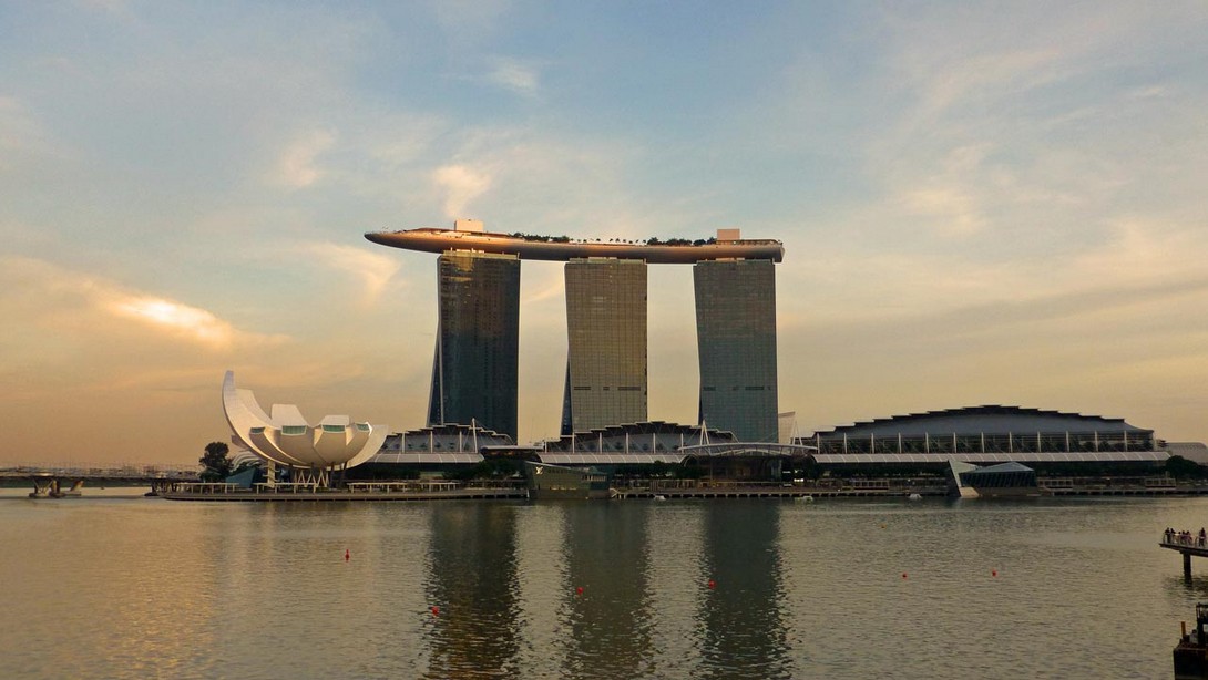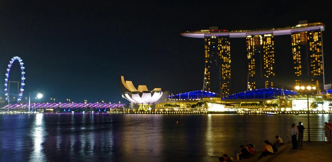 Das muschelförmige Gebäude auf der linken Seite des Bildes ist das Art Science Museum. Es hat die Form einer Lotusblüte und ein Schiebedach, das bei Regen geschlossen werden kann.