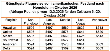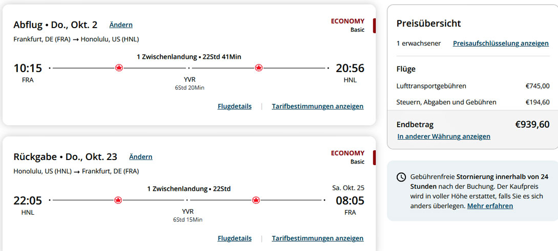 Schauen Sie sich auch die Flugverbindungen von Frankfurt nach Hawaii mit Air Canada über Vancouver an! Es kann durchaus sinnvoll und lohnend sein, nicht über die USA, sondern über Kanada nach Honolulu einzureisen. Die Verbindungen nach Vancouver sind mit der Lufthansa oder besser noch mit Air Canada sowohl in den Flugzeiten wie auch in den Preisen durchaus akzeptabel. Bei einer Buchungsabfrage im Oktober 2025 erreichte ich bei Air Canada folgende Angaben: