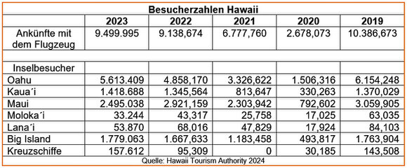 Unter den Besuchern sind natürlich vor allem Amerikaner, aber auch bei den Deutschen ist Hawaii sehr beliebt. Es sind jedoch immer nur knapp 40 000 pro Jahr, die die Inseln besuchen. Das staatliche Touristenbüro hat ein besonderes Programm aufgelegt, mit dem noch mehr Touristen nach Hawaii gelockt werden sollen. Die Besucher lassen jedes Jahr mehr als 1,5 Mrd. Dollar auf den Inseln. Man will die Werbung in Ostasien intensivieren und allein mehr als 2 Millionen Japaner pro Jahr hier begrüßen. Im Augenblick ist es so, dass die Zahl der Touristen aus Korea, China und besonders Australien wieder stark zugenommen hat. Die Zahl der Kreuzfahrtschiffe nimmt wieder zu, die Hawaii anlaufen. 2022 waren nur noch 95,309 Kreuzfahrer hier ausgestiegen, während es im Jahre 2013 noch über 170 000 waren. Während der Pandemie liefen 2021 überhaupt keine Kreuzfahrtschiffe die hawaiianischen Häfen an, im Jahre 2024 stiegen hier wieder 168,123 Kreuzfahrer aus. Für 2025 liegen noch keine aktuellen Zahlen des hawaiianischen Touristenbüros vor.