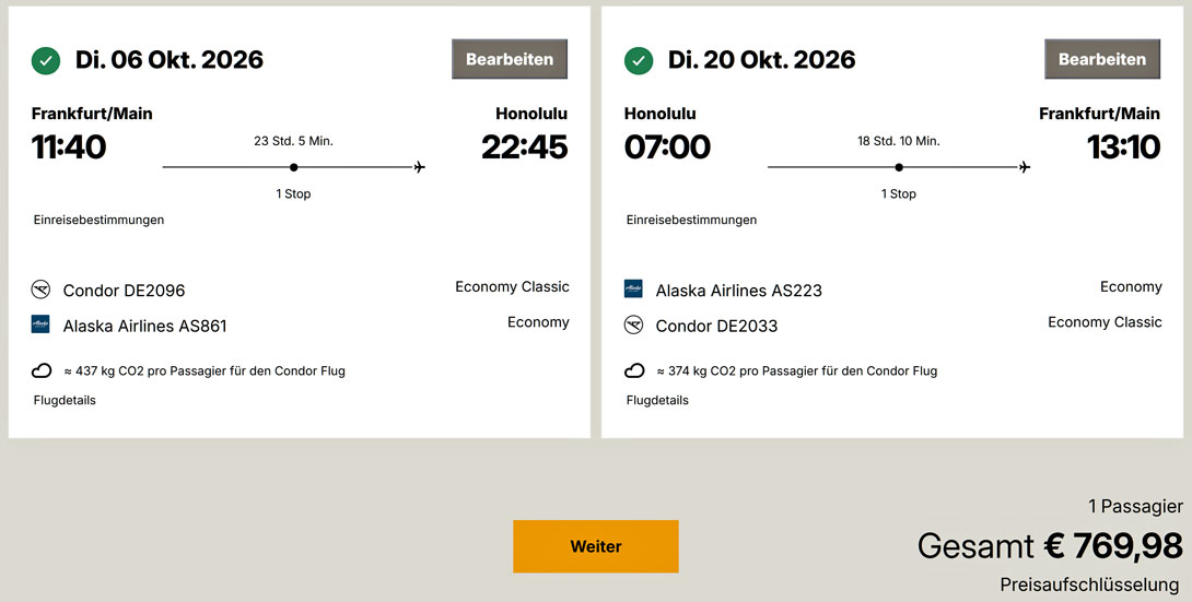 Condor ist im Übrigen die zur Zeit günstigste Variante für einen Flug nach Hawaii, weil sie seit Mitte 2023 eine Symbiose mit Alaska Airlines eingegangen ist, die nicht nur durch die Anrechnung von Meilen für beide Fluggesellschaften positiv ist, sondern auch eine hervorragende Flugverbindung von Frankfurt nach Honolulu geschaffen hat. Die Preise und Flugzeiten sind zur Zeit unschlagbar. Hier ein Beispiel für einen Flug im Oktober 2026 von Frankfurt nach Honolulu: