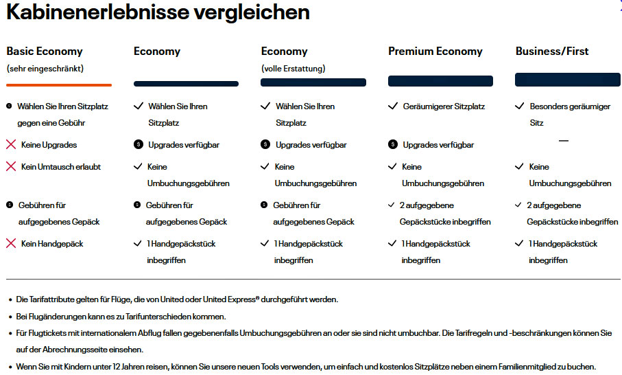 Die Preise variieren natürlich dauernd und hängen auch noch von vielen anderen Faktoren ab. In den meisten Fällen muss mindestens 3 Wochen vorher gebucht oder sofort bezahlt werden. Die Preise haben sich im Jahr 2026 geringfügig erhöht. Schauen Sie deshalb unbedingt auf die aktuellen Webseiten der Fluggesellschaften! Denken Sie auch daran, dass bei einer Buchung in den USA zu den angegebenen Preisen immer noch die Steuer hinzugerechnet werden muss. Außerdem enthalten die Basic-Economy Preise kein Gepäckstück, keine Sitzplatzwahl und keine Möglichkeit einer Buchungsänderung. Bei dem billigsten Flug von San Francisco nach Honolulu am 6.10.2026 mit United, den Sie in der obigen Tabelle sehen, kommt man dann statt auf 505 $ auf United hat eine Übersicht der Tarifbedingungen herausgegeben, die den Unterschied der Tarifklassen sehr deutlich macht: