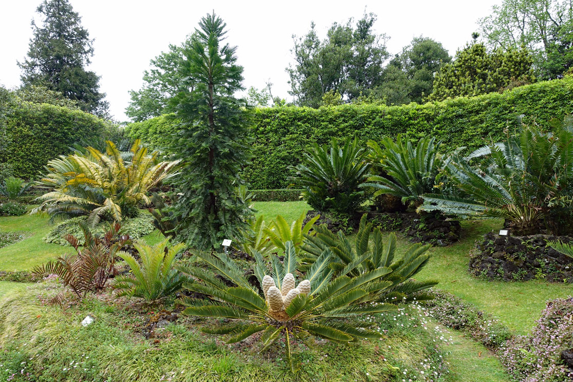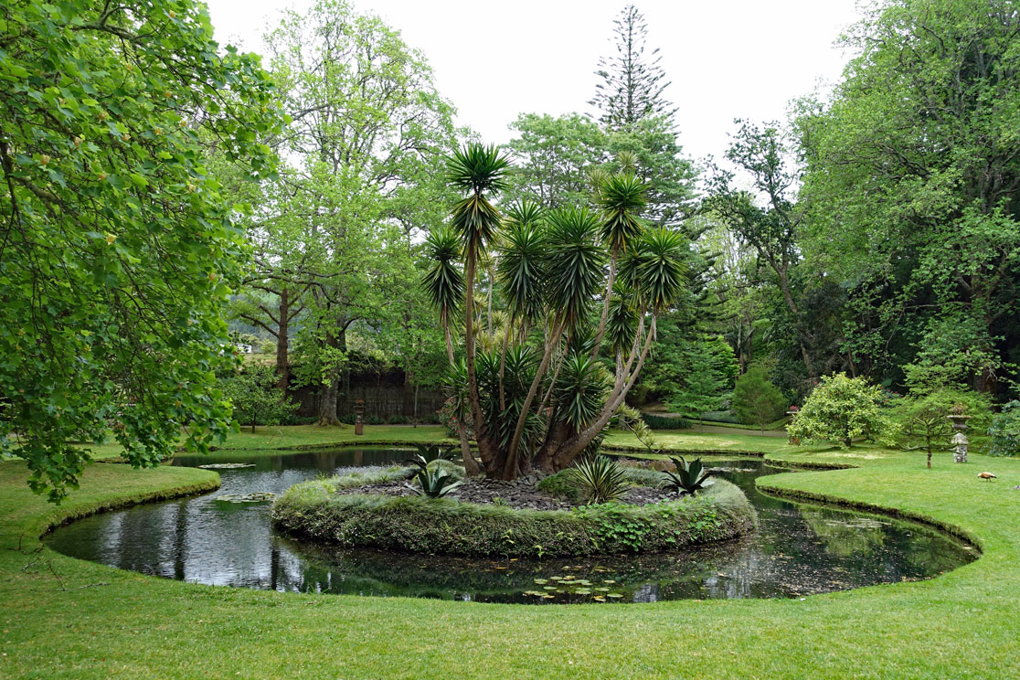 Hugo erklärt die geomorphologischen Bedingungen, unter denen sich die Insel entwickelt hat. Alle Wiesen sind wunderschön grün und saftig. Wir bedauern es ein wenig, dass wir nicht einen Monat später hier sind, denn am Wegesrand stehen üppige Hortensienbüsche , die hier wild gedeihen und zur Zeit der Blüte ein farbenprächtiges Bild abgeben müssen. Man müsste tatsächlich diese Insel im Juli besuchen. Jetzt lassen sich in den Stauden nur wenige Blüten erkennen. Anders ist das mit den Azaleen, die an vielen Stellen in voller Blüte sind. Auch die Lilien blühen überall. Die Bäume treiben gerade erst aus, sodass die Platanen und Ahornbäume nur kleine grüne Spitzen haben. Dazwischen sind die japanischen Schirmtannen, Sicheltannen und Araucarien vielfach ein Blickfang, weil sie als riesige Exemplare herausragen. Es ist schon ein fantastisches Klima, was hier auf den Azoren das ganze Jahr über herrscht.
