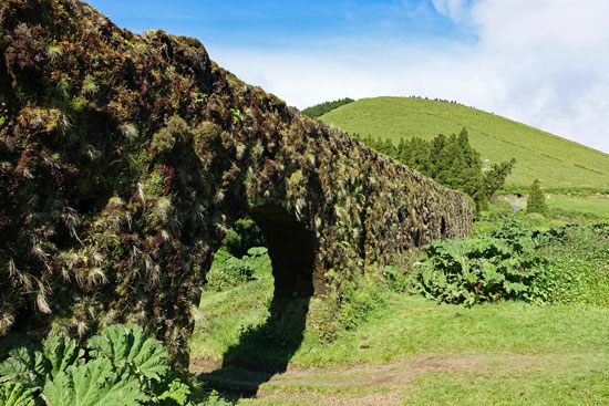 Ein Stück weiter halten wir an einem Aquädukt aus Lavasteinen und den kleinen Seen Lagoas Empanadas in einer Caldeira.