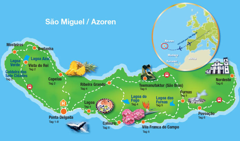 So freuten wir uns auf die Reise und erhofften uns natürlich für die Woche ein "Azoren Hoch". Diese Karte aus dem Prospekt von Trendtours stellt ganz instruktiv die Insel mit den vorgesehen Touren dar. Schaut man sich die Klimadaten an, so gibt es dort leider nicht immer ein Azoren-Hoch. Vielmehr waren für Mitte Mai Durchschnittstemperaturen von 19° C und für den Abend deutlich kühlere Temperaturen angesagt. Das erstaunte uns schon, denn immerhin liegen die Azoren mitten im Atlantik etwa auf dem 38. Breitengrad, was der Höhe von Südportugal entspricht. Mitten im Atlantik ist natürlich nicht ganz richtig, denn bis zur portugiesischen Küste sind es 1600 km und auf der anderen Seite bis zur amerikanischen Küste 4100 km. Jedenfalls spielen die Meeresströmungen eine große Rolle für das Klima dieser Inseln und es waren auf der Tabelle nur 2 Regentage für den Monat Mai verzeichnet.