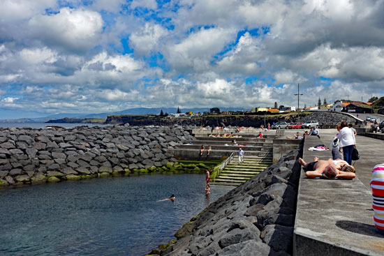 Eine Kaffeepause legen wir in Capelas ein, wo jetzt am Wochenende doch einige Paare im Meeresschwimmbad auf den Betonflächen liegen und sich sonnen. Attraktiv ist ein solches Schwimmbad aber nicht.