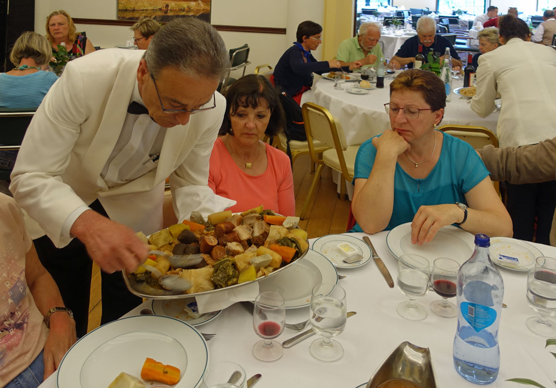 Im Hotel Terra Nostra sitzen wir dann zusammen mit anderen Gruppen an großen runden Zehnertischen, die aber alle sehr ordentlich und stilvoll gedeckt sind. Natürlich ist die Menge der Fleisch- und Gemüsestücke, die der Kellner auf die Teller packt, viel zu groß. Dazu wird eine Sauce serviert. Eine Mangoldsuppe vor dem Hauptgang und Ananas als Dessert vervollständigen das komplette Menü. Sämtliche Getränke sind inbegriffen. Eigentlich ist das Essen sehr ordentlich - schade nur, dass es eine Massenabfertigung in dieser großen Halle ist.