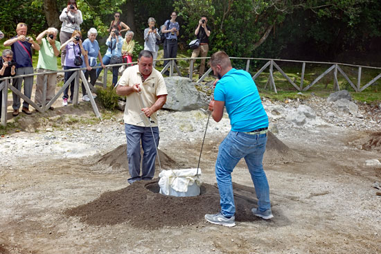 Unser Mittagessen wird heute in einem Erdloch bei den Fumarolen gekocht. Wir schauen uns die Entnahme der Töpfe aus den Fumarolen an. Die einzelnen Hotels oder Restaurants haben für die vorgebuchten Gäste die Töpfe vorbereitet, in denen geschichtete Fleisch- und Gemüsesorten in dem 90°C heißen Vulkandampf gegart werden.