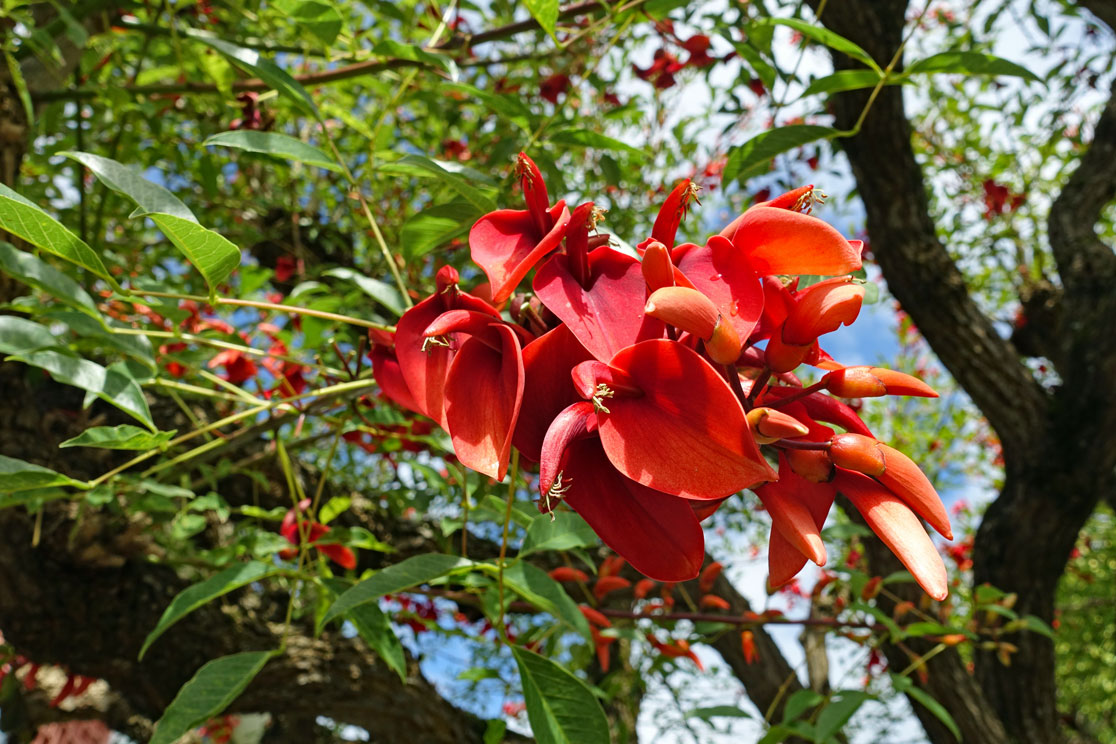 Wesentlich schöner ist der Jardin Antonio Borges, zu dem wir anschließend wiederum zu Fuß gehen. Dadurch kommen wir auch an vielen schön gestalteten Gärten vorbei, in denen vornehme Villen stehen. Von manchen exotischen Bäumen und blühenden Pflanzen sind wir total begeistert. Wir wissen allerdings nicht, wie diese Bäume heißen. Hier ein Beispiel von einem Baum mit fantastischen roten Blüten: