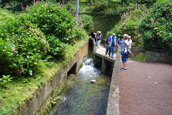 Durch viele Serpentinen und schmale Ortsdurchfahrten muss uns unser Busfahrer Daniel hindurchmanövrieren, weil wir nach der Anordnung von Hugo nicht die Hauptstraße nehmen, sondern durch die einzelnen Orte an der Küste fahren. Er möchte uns die Landschaft auf ihren ursprünglichen Straßen und den typischen kleinen Häusern der früheren Siedler zeigen. Das ist auch sehr interessant, zumal es zwischendurch immer spektakuläre Ausblicke auf Buchten, Vulkankegel und Windmühlen gibt. Wir besichtigen auch an den Kanal Junta Geral, der dafür sorgt, dass das Wasser des Lagoa Azul bei Hochwasser ins Meer abfließen kann.