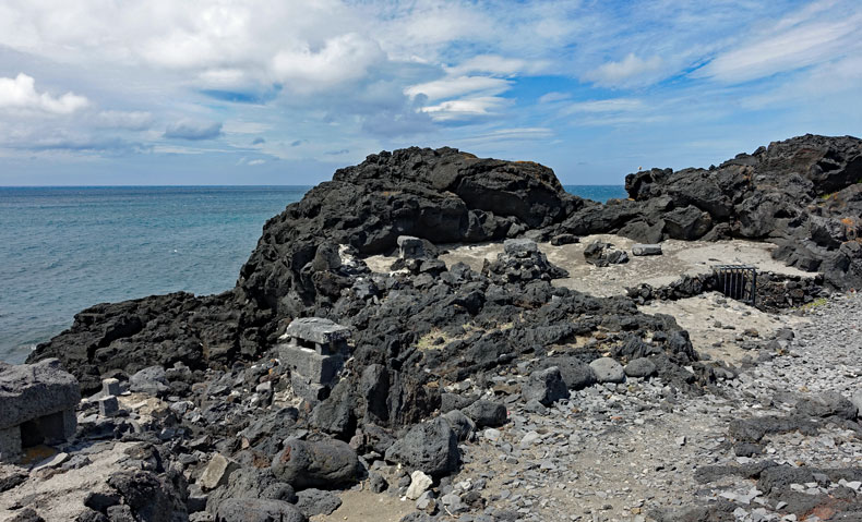 Über Rabo de Peixe geht es weiter nach Praia Santa Barbara, wo wir über den dunklen Sandstrand ans Meer gehen und uns die Kasematten anschauen.