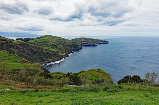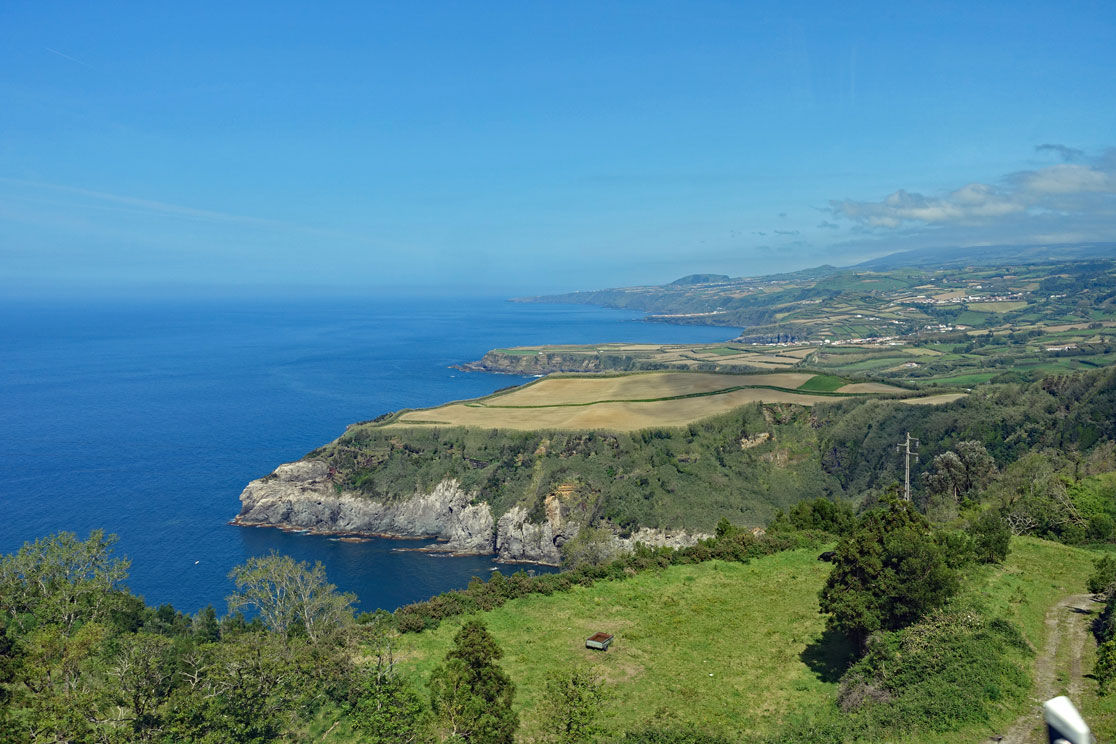 Die Fahrt geht weiter zur Ponta do Escalvado, einem Aussichtspunkt an der Westseite der Insel. Von dort kann man über die Steilküste auf die Bucht und den Ort Mosteiros hinüberblicken.