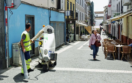 In den letzten 15 Jahren hat man den Tourismus als Einnahmequelle entdeckt, Kreuzfahrtschiffe hierhin gelockt und die Natur der immergrünen Insel für Wanderungen und Thermalbäder erschlossen. Unser Rundgang führt am Theater vorbei zum Mercado, der aber nicht besonders spektakulär ist. Total erstaunt sind wir über die sauberen Straßen. Die sind zwar alt und eng, aber nicht schmutzig. Und in den Hauseingängen und Häuserecken liegt auch kein Abfall und kein Schutt. Den Grund dafür sehen wir in der Fußgängerzone, wo ein Straßenreiniger zu Fuß gerade mit einem großen Staubsauger die Ecken saubermacht. Nachdem wir das bemerkt haben, fallen uns auch deutlich mehr Straßenreiniger auf. Die engen Straßen und Gassen sind ein echtes Problem. Die Autofahrer sind aber geduldig und keiner hupt. Sie lassen den Fußgängern immer den Vortritt. Dennoch ist es schon schwierig für beide, sich durch die engen Gassen hindurchzumanövrieren. Beeindruckend sind jedenfalls die vielen Mosaike auf den Straßen, die aus weißen Kalksteinen und grauen Granitsteinen gebildet wurden. So auch vor dem Rathaus, wo das Denkmal des Heiligen Michael steht, nach dem die Insel benannt ist. Hier einige Bilder vom Stadtrundgang: