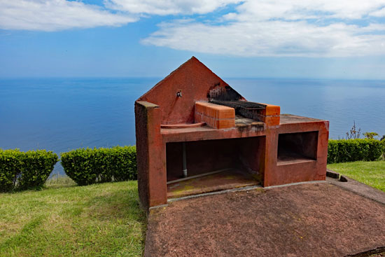 Wir sind sehr angetan von dieser Umgebung und können uns vorstellen, dass hier im Sommer sehr viele Wanderer ein Picknick machen oder auch grillen, weil überall Grillplätze mit Feuerholz und Wasseranschlüssen vorhanden sind. Alles ist sehr sauber und gepflegt; Toiletten sind auch vorhanden. Von oben hat man einen schönen Blick über die Steilküste und kann weiter unten den Leuchtturm vom Kap Ponta do Arnel an der Ostküste der Insel sehen.