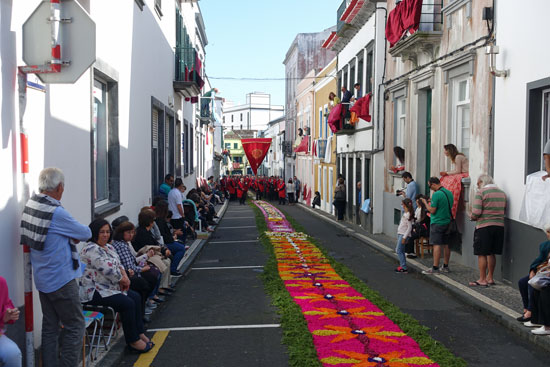 Im Hotel kommen wir um 16:20 Uhr an und machen uns natürlich sofort auf, um den Beginn der Prozession am heutigen Santo-Christo-Feiertag nicht zu versäumen. Wir haben den Eindruck, dass die gesamte Stadt unterwegs ist, um die Prozession zu sehen. Alle streben irgendwelchen Punkten zu, an denen sie stehen bleiben, um auf den Zug zu warten. Wir haben Glück, denn am Ende der Rua Peru stoßen wir auf den Anfang der Prozession, die um kurz nach 17:00 Uhr loszieht. In gemächlichem Schritt schreiten zunächst Hunderte von Männer aus Bruderschaften, Kirchengemeinden oder Ortschaften schweigend an uns vorbei. Viele schwitzen ganz schön in der ziemlich warmen Nachmittagssonne, weil sie über ihren Anzügen mit Hemden und Krawatten noch einen Umhang tragen. Zwischendurch marschieren viele Blaskapellen mit und danach kommen die als Engelchen verkleideten Kinder. Sie dürfen als erste über den Blumenschmuck in der Mitte der Straße laufen, der von den Anwohnern mit Blumen und bunt gefärbtem Rindenmulch als Teppich dekoriert wurde. Nach einiger Zeit erscheint die Portiere mit der Christus-Statue aus der Kirche, die von 10 Trägern getragen wird. Sie muss ziemlich schwer sein, denn die Träger schwitzen und sie wird oft abgesetzt. Auch der Bischof und sogar der Kardinal von Portugal sind dabei. Und viel Weihrauch gehört dazu, der die engen Straßen ziemlich vernebelt.