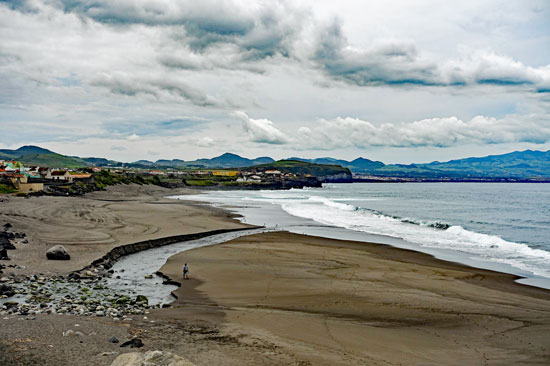 Es geht heute nach Osten an der Küste entlang und der Lagoa do Fogo ist unser Ziel. Es ist noch früh am Morgen und die Sonne ist noch nicht durch die Wolken gedrungen. Das ist ein bisschen schade, denn für gute Fotos von den Stränden fehlt das Sonnenlicht. Hier ein Bild von Areal Grande mit der Pfarrkirche von São Roque: