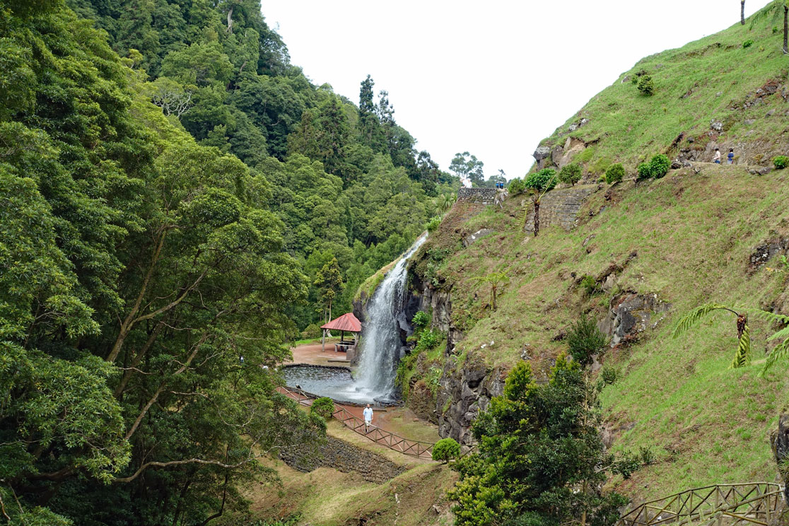 Die Naturlandschaft mit den riesigen Farnen und den tropischen Pflanzen erinnert sehr stark an Neuseeland. Der Park ist schön gestaltet mit vielen Wanderwegen, von denen einer zu einem Wasserfall führt, dessen Wasserlauf man über Fumarole geführt hat, die es auf 38°C erwärmen, sodass man in einem dort angelegten Naturbecken baden kann. Es sitzen einige Leute darin wie in einem Whirlpool und sind ganz happy. Das Wasser ist durch Eisenoxid rot gefärbt und an manchen Stellen treten Schwefeldämpfe aus. Unser Reiseführer Hugo demonstriert eine Dampffontäne, indem er seinen Zigarettenrauch in eine Öffnung bläst und dadurch eine chemische Reaktion mit den CO2-Bestandteilen seiner Ausatemluft und dem Schwefelwasserstoff der Sulfatare einen kräftigen Dampfausstoß erreicht. Er will uns nicht davon abhalten, auch ein Bad zunehmen, erklärt aber, dass sich das hier eigentlich nicht lohne, denn wir hätten ja noch eine Fahrt nach Furnas vor uns und dort sei das Thermalbecken wesentlich größer und schöner.