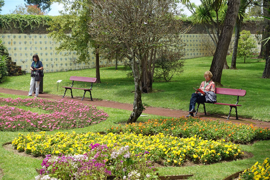 Uns gefällt dieser Garten sehr, der von Antonio Borges gestiftet und angelegt worden ist. Er war der erste und wohl erfolgreichste Ananasbauer der Insel. Die Bäume wurden im 19. Jahrhundert gepflanzt und haben heute riesige Ausmaße. Alles ist dicht und von Moos überwuchert. Viele Treppen und Wege führen zu versteckten Plätzen und Grotten. Kein Wunder, dass dieser Garten zum Lieblingsziel von verliebten Pärchen geworden ist, die hier einen romantischen Spaziergang machen oder sich einen Abend im Mondlicht vorstellen. Genügend Parkbänke sind vorhanden und wir können jedenfalls viele Teenager aus den benachbarten Schulen beobachten, die hier ihre Mittagspause verbringen. Außerdem sind viele Muttis mit Kinderwagen auf dem Spielplatz.