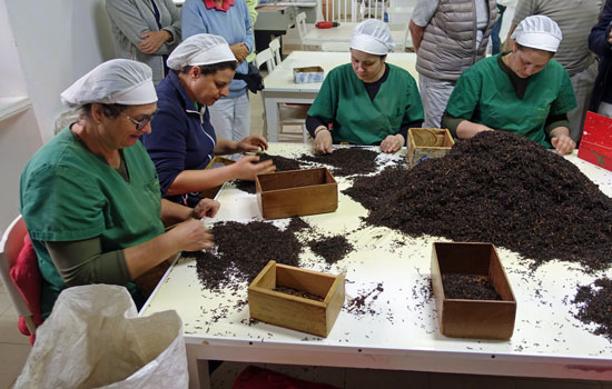 Heute Morgen ist die Internetverbindung ganz ausgefallen. Das stört uns aber wenig, denn um 9:10 Uhr starten wir zur längsten Rundfahrt nach Nordeste; 186 Tageskilometer sollen bewältigt werden. Der erste Halt ist die Teeplantage Chá Gorreana südlich von São Brás an der Nordküste. Es ist Europas einzige Teeplantage, die von 62 Teeplantagen übrig geblieben ist. Nach dem 2. Weltkrieg begann der Niedergang und nur Chá Gorreana hat überlebt. Es ist ein Familienbetrieb, der im Jahr etwa 50 Tonnen Tee produziert. Die Felder sind gut gepflegt und müssen alle 14 Tage nachgeschnitten werden. Die Besichtigung der Anlage ist wenig informativ, da man nur die Maschinen sieht, aber keine Verarbeitung. Einzig 4 Mitarbeiterinnen sitzen in einem Raum an einem Tisch und sortieren einen Berg Teeblätter. Das ist nur eine Show für den Reisebus. Danach wird die Gruppe in einen Shop weitergeleitet.