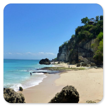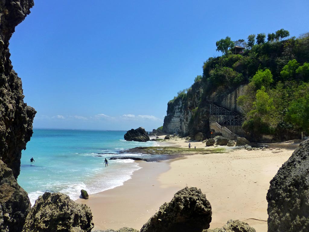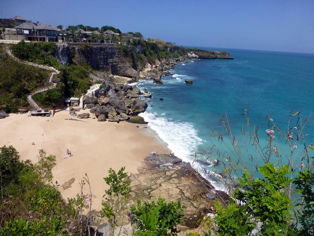Inzwischen haben wir auch die Gegend erkundet. Unsere Annahme, dass hier im Ayana nur Pools von Interesse sind, war nicht richtig, denn als wir uns mit dem Buggy zum Kubu-Beach fahren lassen, finden wir dort eine wunderschöne Bucht unterhalb der Felsen, die auch zum Resort gehört. Man muss zwar 190 Stufen hinunter und hinauf klettern, aber unten entdeckt man eine ordentliche Dusche, eine gepflegte Toilette, bequeme Liegen im Schatten und einen tadellosen Sandstrand ohne Unrat oder angeschwemmtes Grünzeug.