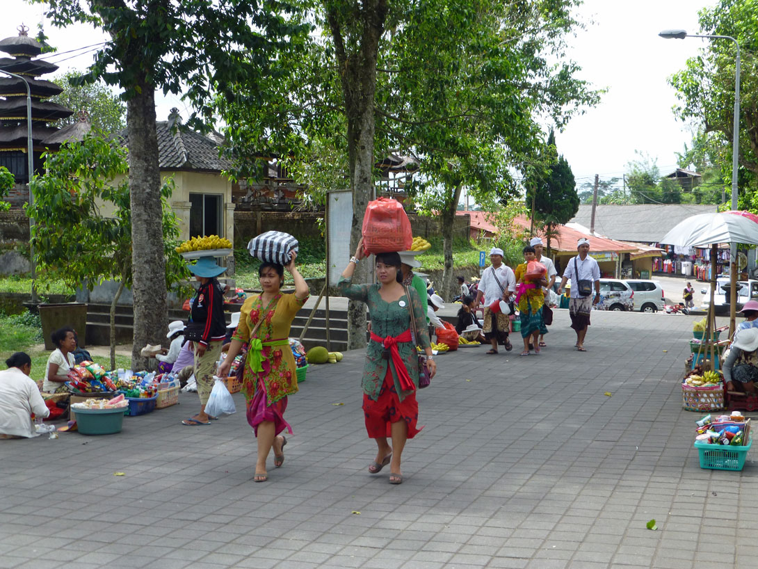 Wir fragen Kerji, warum hier um diese Touristenattraktion die Straßen und Parkplätze so schlecht gewartet werden und die Gebäude und Anlagen so wenig attraktiv aussehen, wo doch hohe Eintrittsgelder verlangt werden und alle von dem Touristenstrom so gut leben können. Er erwidert uns, dass die Dörfer von ihren Einnahmen 50% an den Staat abgeben müssen, sie schicken das Geld nach Jakarta und hoffen vergeblich, dass jemand ihre Dorfstraße erneuert. Die Korruption ist ungeheuer hoch und das Geld verschwindet in unerfindlichen Kanälen. Als wir durch ein Dorf fahren, sehen wir auf einem Feld eine enorme Ansammlung von Mopeds und Männern, die beim Hahnenkampf zuschauen und wetten. Das Polizeifahrzeug vor uns hält links an und unser Reiseleiter, erklärt uns, dass die Polizisten einen Bonus bekommen, damit sie wegschauen und weiterfahren.So biegt halt jeder sein Recht zurecht. Und im Verkehr geht es auch so zu. Einbahnstraßen gelten nur für den, der sie sehen will. Überholverbote oder andere Regeln ebenfalls. Aber seltsamerweise funktioniert es und wir sind total erstaunt, dass wir auf unseren Fahrten keinen einzigen Unfall gesehen haben. Man muss es auch irgendwie der balinesischen Gelassenheit zuschreiben, die sich einfach in die Gegebenheiten fügt und das Beste für sich daraus herausholt.