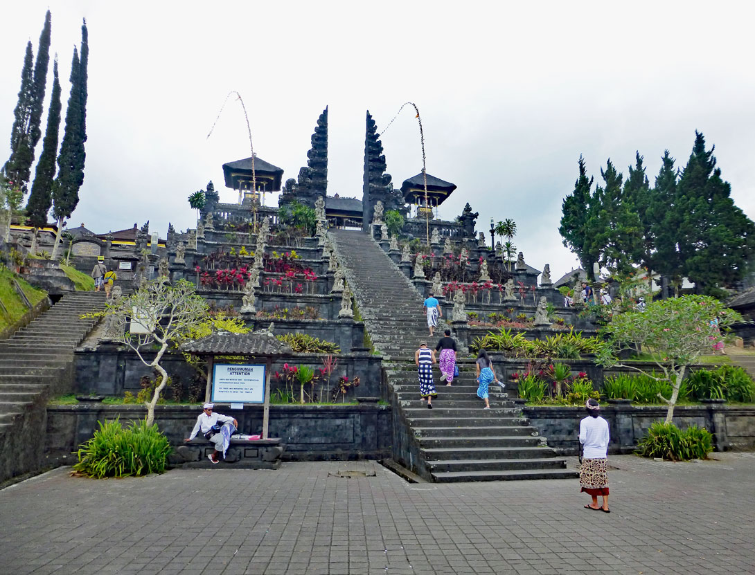 Anschließend geht es über die schmale Serpentinenstraße weiter nach Besakih. Für 35000 Rupien dürfen wir zum Tempel hinauf, der an der Flanke des höchsten Bergs von Bali liegt und angeblich schon im 8. Jahrhundert als Heiligtum dient.